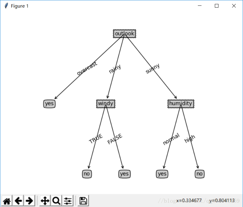 该函数即为上图中决策树学习的基本算法,可以看到,它以 2 个条件做为迭代终止的条件,第一个是样本在类别中取值相同,这就说明已经到达了叶子节点,做出了最终决策,该阶段任务完成。第二个是只剩下一个类别时,迭代终止,到达最终的叶子节点。 以上程序为树的核心程序,剩下的用 matplot 绘图工具将生成的树绘出即可,程序如下