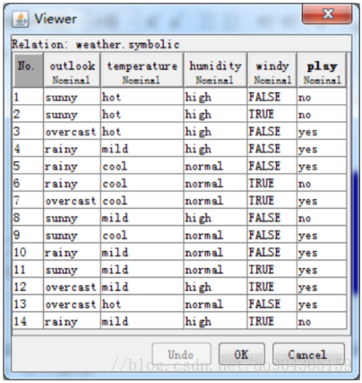 dataSet = [['sunny', 'hot', 'high', 'FALSE', 'no'],