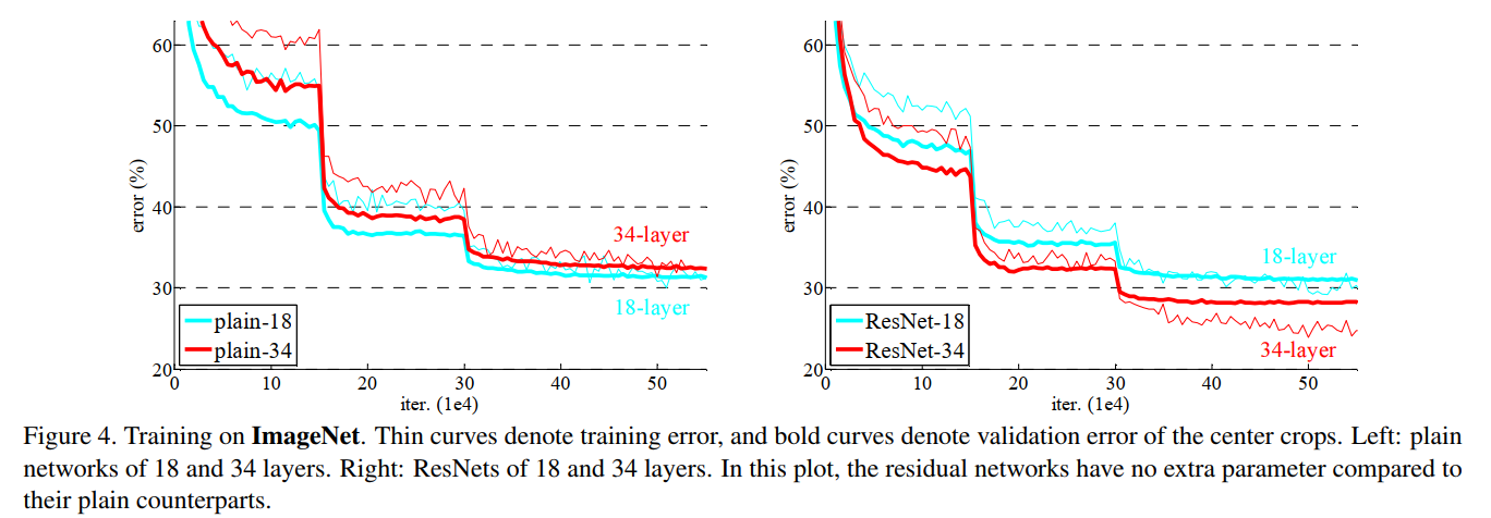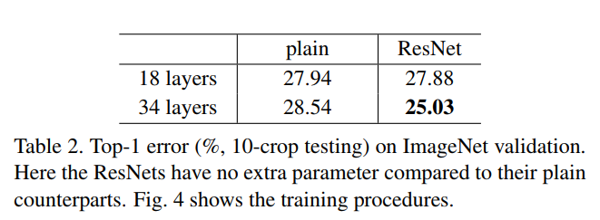- 和 plain 的 34 层网络相比,ResNet34 获得了更小的训练误差,表明了残差系统可以在极深的系统中学习